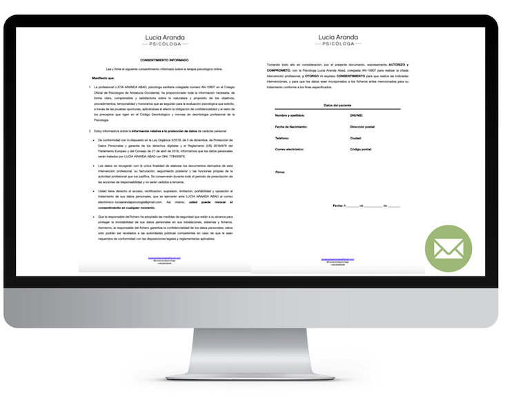 Te pediré un email para poder enviarte un documento llamado «Consentimiento Informado» , en el que se explican todos los términos de la terapia, en el que también se incluye un apartado donde solicito tus datos básicos para poder abrirte la ficha. Sería algo así como nuestro contrato.